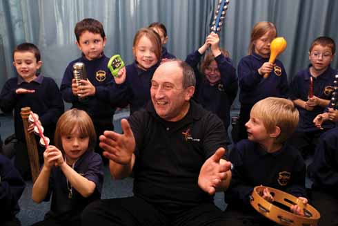 Andy Baker with the children of Heathlands School, which has benefited from BSO Blast, the Orchestra’s music-making project that takes music into schools