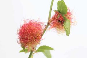 Robin’s Pincushion Gall on a rose plant caused by another wasp. Similar, but less dramatic galls on hawthorn and Norway Maple are caused by midges and aphids