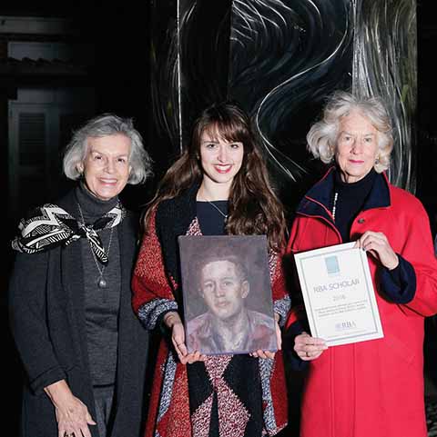 Successful RBA Scholar Laura Hounsell (centre) with her portrait ‘Christopher’ flanked by Susie Pearson (left, vice chair) and Delia McLaggan, chair of The Arts Society Dorset County