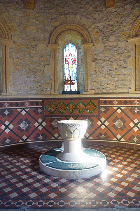 The lovely tiled area in the apsidal end housing the font at Melplash’s fascinating Christ Church, which also houses a badminton court