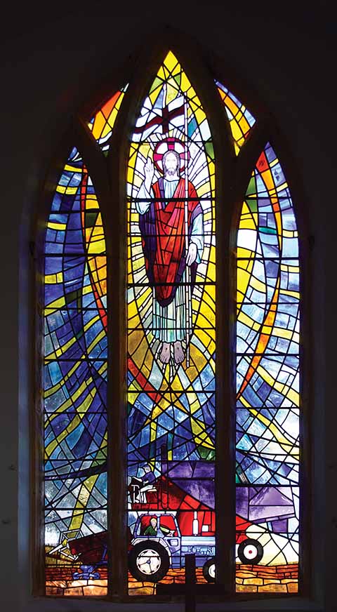 Mosterton’s church, another St Mary, is home to this stunning stained glass window blessing the work of farmers